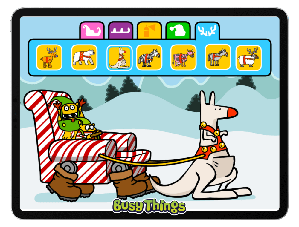 They can mix and match all sorts of parts: vehicle bodies, wheels, runners, drivers and even the animals pulling it. A festive bathtub pulled by a kangaroo? A rocket-sleigh driven by a monster? Anything goes in Custom Sleigh!